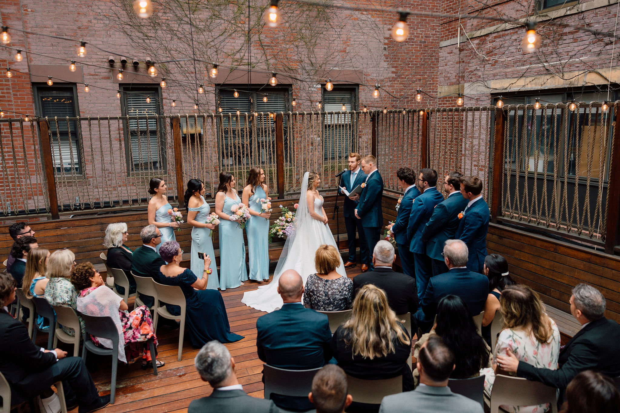The day began at the Fairmont Copley Plaza, where the couple got ready in the heart of the city. The timing couldn’t have been more quintessentially Boston – it happened to be the day of the Pride Parade, and from their suite, they had the perfect perch to watch the rainbow-filled festivities below. The excitement in the city only added to the sense of celebration, and despite a bit of rain throughout the day, spirits remained high.