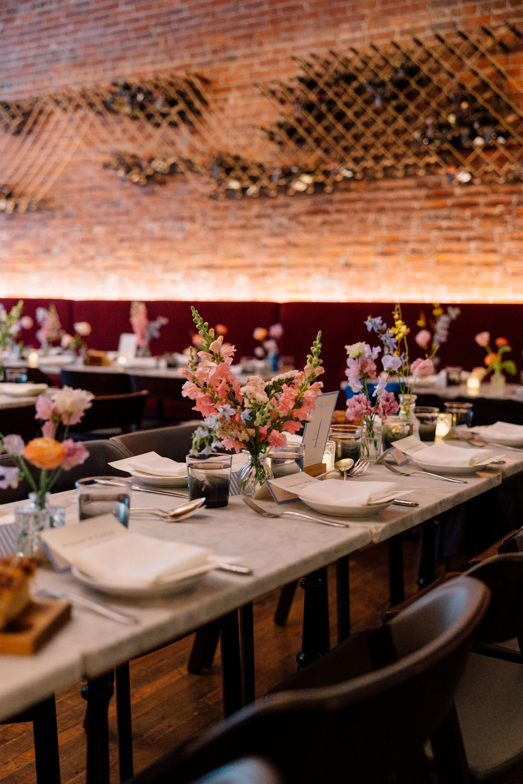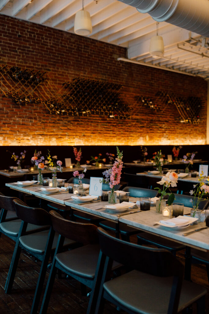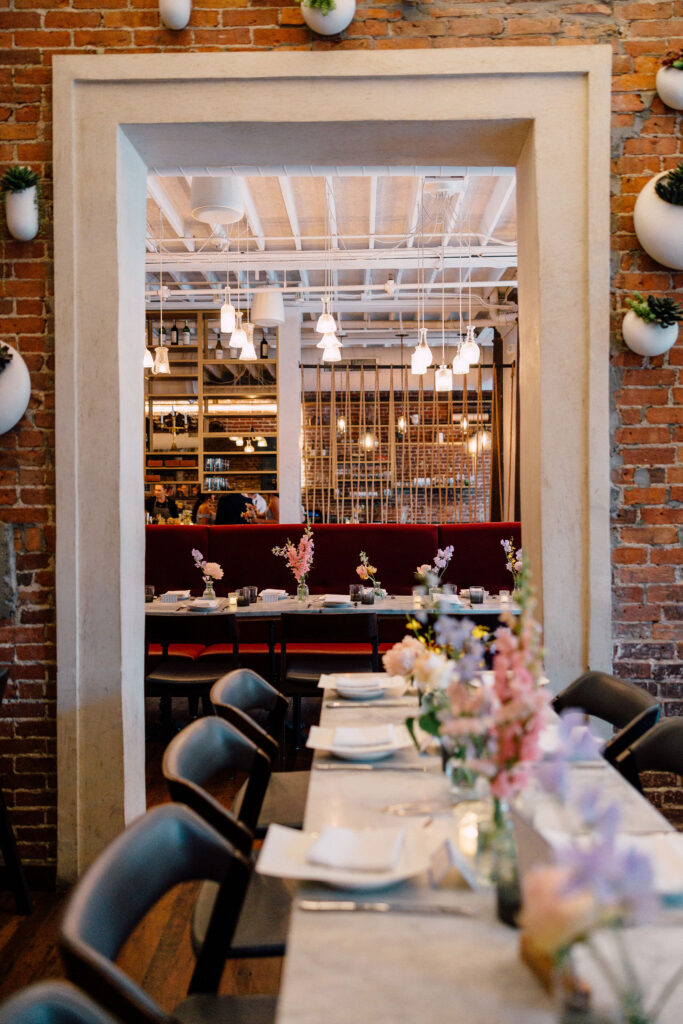 When guests arrived at SRV, one of Boston’s beloved Italian restaurants, they were welcomed into a space that already radiates warmth and character. The couple chose a minimalist design approach, letting the restaurant’s architectural beauty take center stage. Down the length of the communal tables, delicate spring-hued florals added just the right touch of color and softness – subtle yet celebratory.