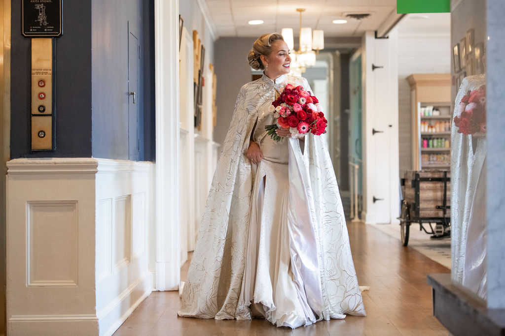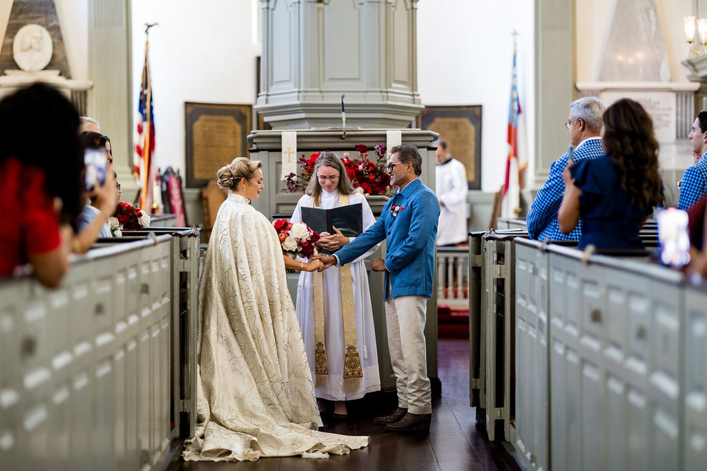 On July 4th, the wedding day started at Hotel Viking, where Rachel and her bridal party prepared in style. Rachel wore three distinct outfits designed by David Josef Fashion and styled by The Boston Bridal Stylist. Each outfit was unique and full of personality. A vintage car took her to the historic Trinity Church, where she and Jacob exchanged heartfelt vows in front of family and friends.