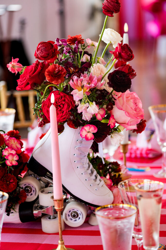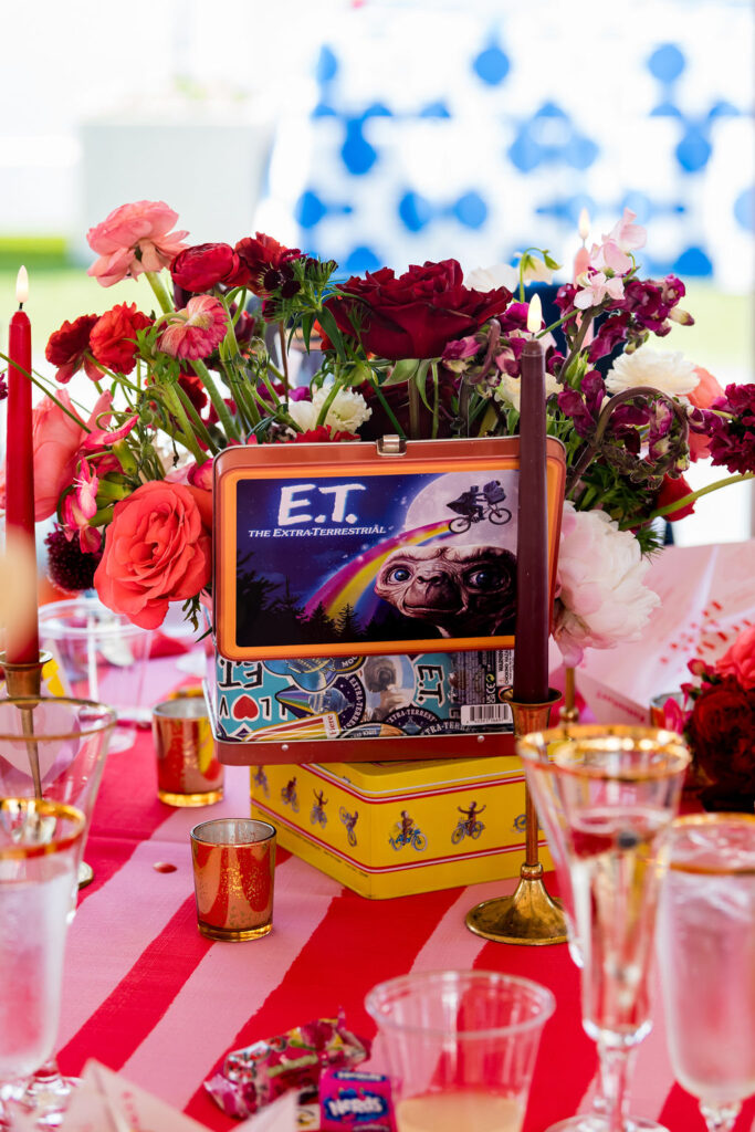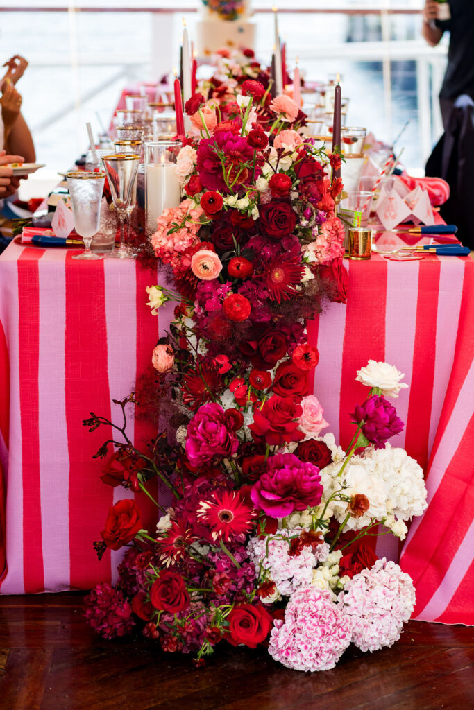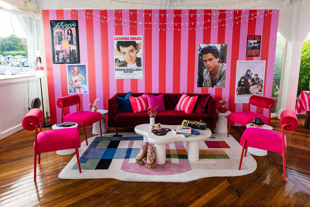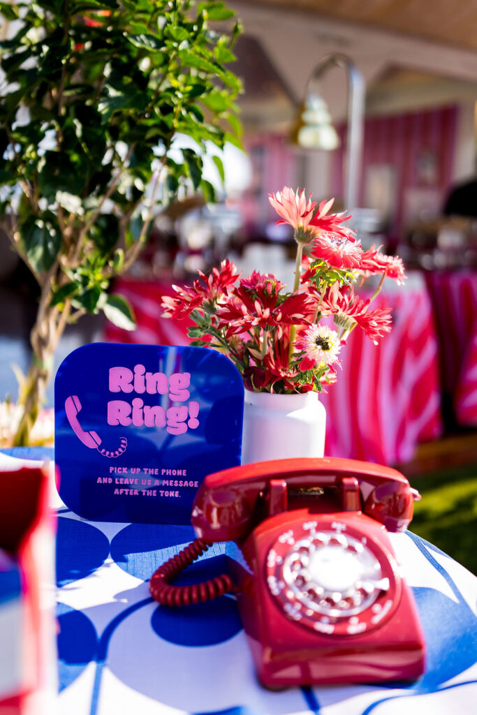 As the sun set, everyone came together at Regatta Place, a beautiful venue overlooking the marina and Newport Bridge. The design drew inspiration from the Fourth of July colors but added a modern flair with bright pinks and royal blues, giving it a lively, festive feel. Fun touches inspired by the 80s added character and a sense of nostalgia, including a “Party on Dudes” marquee sign and a lounge that resembled a teen’s bedroom from the 80s. Each corner showcased Rachel and Jacob’s imaginative vision.